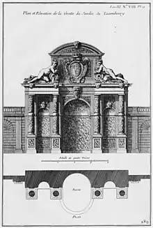 - ↑ See Yves Marie Allain and Janine Christiany, L'art des jardins en Europe, and Luigi Gallo in Paris et ses Fontaines, both of which attribute the fountain to Francini. De Brosse is sometimes credited with designing the fountain, but he died in the same year the fountain was built, and before his death he was involved in a lawsuit with Marie de' Medici over non-payment of his fee; court documents detailed all the work he had done for the Queen, and there was no mention of the fountain. See Luigi Gallo, pg. 56.