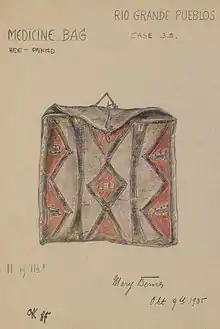 A medicine bag is usually a small pouch, worn by some Indigenous peoples of the Americas, that contains sacred items. A personal medicine bag may contain objects that symbolize personal well-being and tribal identity.[1][2] Traditionally, medicine bags are worn under the clothing.[3] Their contents are private, and often of a personal and religious nature.[4]
