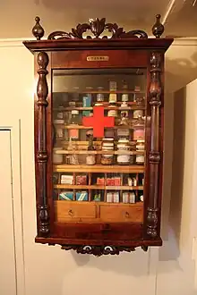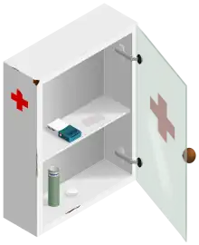 A medicine cabinet is a cabinet used to store medications and other hygiene products. They are often locked and placed high enough such that it can not be accessed by small children. Medicine cabinets can be placed in many different places depending on the intended use and available space, and can for instance be found in workshops, bathrooms or hallways. Non-lockable bathroom cabinets are sometimes used as improvised medicine cabinets.