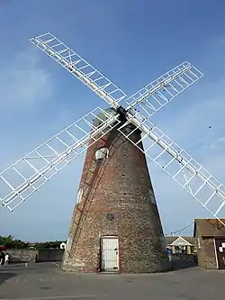 Medmerry Mill was built as a five-storey mill, driving two pairs of millstones. Holloway's completely refitted the mill in 1908, resulting in a four-storey brick tower mill with a domed cap which was winded by a fantail. It has four Patent sails carried on a cast iron Windshaft. The Brake Wheel is iron.[2]