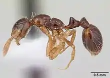 Material from Central America and Venezuela is very similar in color and mandibular dentition. Workers are solid black, and the basal teeth of the mandible vary in size, the second from the base being much larger than the flanking teeth. As a result the mandible appears falcate rather than triangular. A collection from Colombia is distinctive, with the color lighter red brown and the basal teeth of the mandible of more uniform size. Other size and shape characters, including the highly distinctive petiole, are the same as other M. incisus. M. incisus has a range disjunction. It is moderately abundant in Winkler samples from Guatemala and southern Mexico, occurs in Panama and Venezuela, yet has never been collected in Costa Rica, in spite of extensive survey work there.[1]