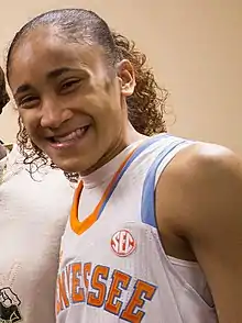 Meighan Sharee Simmons (born January 25, 1992) is a professional basketball Guard. She was selected in the third round of the 2014 WNBA draft, 26th overall.[1] Meighan was born in Cibolo, Texas and attended the University of Tennessee. She was nicknamed "Speedy" by legendary Tennessee Women's Basketball coach Pat Summitt.[2] She played overseas in Romania in 2015 for ICIM Arad leading the team in scoring with 16.4 points per game and averaged almost 4 assists and 4 rebounds as well, shooting 55% from the floor and 36% from 3 point range.[3]