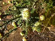 The yellow or cream coloured flowers are in heads or spikes at the ends of branches that continue to grow after flowering. Each head has between 15 and 37 individual flowers, making a group up to 25 mm (1 in) long and 20 mm (0.8 in) in diameter. At the base of each flower there are brown, papery, overlapping bracts which fall off as the flowers develop. The stamens are arranged in 5 bundles around the flower, each bundle containing 3 to 6 stamens. Flowering occurs from August to September but sometimes continues to December. The fruit are woody capsules 1.8–2.6 mm (0.07–0.1 in) long with the sepals remaining as rounded teeth.[2][3]