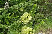 The flowers are arranged in heads near the ends of branches which continue to grow after flowering and sometimes in the upper leaf axils. There are 25 to 30 individual flowers in each head, the heads up to 50 mm (2.0 in) long and 40 mm (1.6 in) in diameter. The flowers are bright lime-green or pale yellow-green and appear in spring and early summer. The petals are 3.5–4.8 mm (0.1–0.2 in) long and fall off as the flowers age. The stamens are arranged in bundles of five around the flower, with 3 to 5 stamens in each bundle. The fruit are woody capsules up to 8 mm (0.3 in) long and 10 mm (0.39 in) in diameter and form clusters around the stem.[2][3]