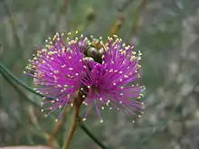 The flowers are a shade of pink to purple and are arranged in heads on the ends of most of the branches, which continue to grow after flowering. The heads are up to 55 mm (2 in) in diameter but more usually about half that size, and contain 10 to 20 groups of flowers in threes. The stamens are in five bundles around the flower, each bundle with 7 to 13 stamens. Flowering usually occurs in September or October and the fruit which follow are woody capsules 3–6 mm (0.1–0.2 in) long in roughly spherical clusters along the stems.[2][3]