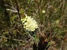 The flowers are a shade of cream to yellow, occasionally pink and are arranged in spikes on the ends of branches which continue to grow after flowering and also on the sides of the branches. The spikes are 20–30 mm (0.8–1 in) in diameter with 10 to 40 individual flowers. The petals are 2.6–4.2 mm (0.1–0.2 in) long and fall off as the flower ages and there are 48–67 stamens in each flower. Flowering occurs mainly from October to January and is followed by fruit which are woody, cup-shaped capsules, 3–4.3 mm (0.1–0.2 in) long.[3][4][5]