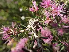 The flowers are a shade of pink to purple and arranged in heads on the ends of branches which continue to grow after flowering and sometimes also in the upper leaf axils. The heads are up to 18 mm (0.7 in) in diameter with up to 3 groups of flowers in threes. The petals are 1.0–1.2 mm (0.04–0.05 in) long and fall off as the flower matures. The outer surface of the floral cup (the hypanthium) is usually hairy and there are five bundles of stamens around the flower, each with 4 to 7 stamens. Flowering occurs mainly in September and October, and is followed by fruit which are woody, cup-shaped capsules, 3.8–5 mm (0.1–0.2 in) long, scattered along the stem.[2][3]