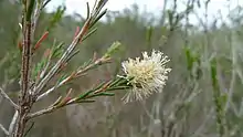 The flowers are arranged in a short spike or head at the ends of branches which continue to grow after flowering and sometimes in the upper leaf axils. The spikes contain 15 to 50 individual flowers and are up to 11 mm (0.4 in) in diameter. The flowers are a light cream colour and each is surrounded by five bundles of stamens, containing 3 to 8 stamens. The petals are 1.5–2 mm (0.06–0.08 in) long and often tinged with pink. Spring is the main flowering season and the flowers are followed by fruit which are woody capsules about 3 mm (0.1 in) long and wide, in clusters along the branches.[2][3][4]