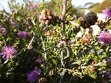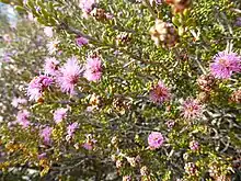 The flowers are deep pink to purple, in heads on the ends of branches which continue to grow after flowering and sometimes in the upper leaf axils. The heads are up to 18 mm (0.7 in) in diameter with 4 to 9 groups of flowers in threes. The petals are 0.6–1.5 mm (0.02–0.06 in) long and fall off as the flowers mature. The stamens are arranged in five bundles around the flower, each bundle with 2 to 6 stamens. Flowers appear between July and December. The fruit that follow are woody capsules 2–4 mm (0.08–0.2 in) long forming almost spherical clusters.[2][3]