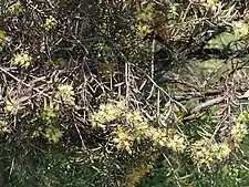 The flowers are creamy green to yellow and are arranged in spikes on the ends of branches that continue to grow after flowering and also in the leaf axils. The spikes are 30–40 mm (1–2 in) in diameter with 15 to 35 individual flowers. The petals are 2.2–4 mm (0.09–0.2 in) long and fall off as the flower ages and there are 37 to 51 stamens in each flower. Flowering occurs in April, October and December and is followed by fruit that are woody capsules, 4.2–4.6 mm (0.17–0.18 in) long.[3][4]