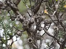 The flowers are white or cream, a single flower (or rarely a pair) on the ends of branches which continue to grow after flowering and are about 10 mm (0.4 in) in diameter. The petals are 3.5 mm (0.1 in) long and fall off as the flowers mature. The stamens are arranged in five bundles around the flower, each bundle with 11 to 26 stamens. Flowers appear in spring and the fruit that follow are woody capsules 3.8–5.5 mm (0.1–0.2 in) long.[2][3][4]