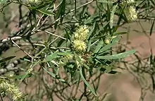 The flowers are creamy-white in colour and are arranged in spikes at the ends of branches which continue to grow after flowering, and sometimes in the upper leaf axils. The spikes contain 6 to 12 groups of flowers in threes well spaced along the inflorescence and are up to 18 mm (0.7 in) in diameter. The stamens are arranged in five bundles around the flower, each bundle containing 6 to 10 stamens. Flowering occurs in most times of the year and is followed by fruit which are woody capsules, 2–3 mm (0.08–0.1 in) long.[2][3]