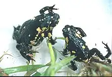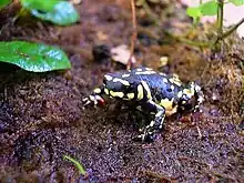 The bumblebee toad was originally described in 1875.[2] It grows to about 2.75 cm, with females almost always being larger than males. The back of the toad is black with yellow spots and stripes. The lower ventral area is black with red markings, and the feet are typically solid red except for the hind toes. These ventral red spots can extend to the dorsum, particularly in females. Markings are highly variable and it is rare for any of them to be symmetrical.