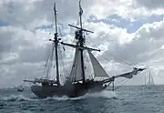 The replica took six years to build and was constructed using traditional 19th century methods.[15] It was constructed using Australian-grown timber,[15] including: jarrah, Huon Pine, Kauri, Celery Top Pine and Ironbark - much of it recycled.[15] The ship's two masts are local California Redwood, its sails are traditional hand-sewn flax and its rigging is traditional tarred hemp.[15]