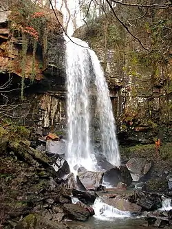 Melincourt Falls is an 80 feet (24 m) high waterfall on Melin Court Brook, a left-bank tributary of the River Neath / Afon Nedd, located 1-mile (1.6 km) south of Resolven in the county borough of Neath Port Talbot, south Wales. It is formed where the brook plunges over a resistant band of 'Lower Pennant Sandstone' in a 13 acres (5.3 ha) nature reserve managed by the Wildlife Trust of South and West Wales.[1][2] The falls have been drawing visitors for at least two centuries – they are certainly known to have inspired J. M. W. Turner to paint them in 1794.[3] The falls are considered by some to constitute a part of Waterfall Country though the bulk of these falls are a few miles further northeast at the head of the Vale of Neath.