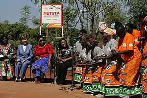 Melinda Doolittle and Laura Bush are greeted by a chorus of singers at the Mututa Memorial Center on June 28, 2007.