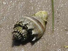 The shell of Melongena corona inhabited by a hermit crab