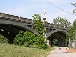 The Memorial Bridge is a two-lane, 785-foot-long (239 m) bridge spanning the Roanoke River along U.S. Route 11 (Memorial Avenue) in Roanoke, Virginia.[1] The bridge serves as a connection between the southwestern areas of the city (including the Grandin Village area) with central Roanoke. Built by contractor W.W. Boxley, the bridge consists of five 120 feet (37 m) spans, with construction commencing in summer 1925.[1] The bridge officially opened to traffic on May 6, 1926, at a final cost of $282,750.[1]
