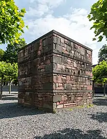 The most prominent part of the memorial site is the frieze of metal blocks on the outer wall of the Old Jewish Cemetery. It commemorates Jews who were murdered during the Nazi era or died as a result of persecution, and who were associated with Frankfurt either by birth (Anne Frank is an example) oder because they had resided there or were deported from Frankfurt. The inscriptions on the metal blocks inform the visitors about the names of these victims as well as their basic biographical data (date of birth, date of death if known and place of death).[2] Visitors can place small stones on the blocks according to Jewish mourning rites.