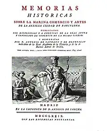 Memorias históricas sobre la marina, comercio y artes de la antigua ciudad de Barcelona. (Historical Records on marine, trade and arts of the ancient city of Barcelona) is a summary paper on the Navy, the trade and the arts of the city of Barcelona, written by the famous Antonio de Capmany y Montpalau.[1]