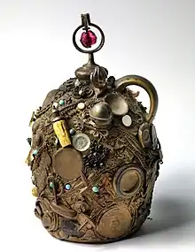 A memory jug may be any kind of vessel but is most usually a jug or vase. Items used to cover the surface range from shards of china, glass, and mirror to shells, beads, buttons, coins, medals, keys, jewelry, toys, watches, and other small objects.[1][2] These are adhered to the surface using some kind of adhesive, typically putty or cement.[1][2][3] The final piece may also be overpainted to create a more uniform surface.[3] Memory jugs are closely related to the broken-china mosaic form known as trencadís that began to appear in the early 20th century.