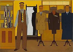 Men's Wear is a 1953 painting by Australian artist John Brack. The painting depicts the interior of a menswear store, including the proprietor and some mannequins, standing in front of displays of ties and trousers. A mirror in the background reflects a silhouette of the artist.[1]