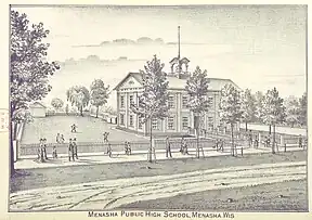 Menasha High School previously occupied two other buildings. The first, built in 1871, was razed in 1896 to expand. The second building was built in 1896 and was completely destroyed by a fire on March 21, 1936.