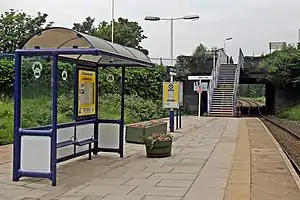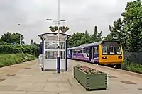 The Meols Cop Electric depot closed on 14 February 1970,[2] and the third rail was lifted shortly afterwards. The station remained well served though, with over 20 trains calling in each direction in the May 1975 timetable and this frequency remained more or less unchanged for the next two decades. Sunday services however ceased in the mid 1980s and the station became unstaffed in 1990, subsequently losing its wooden buildings to demolition in March 2000 (replacement 'bus stop' style shelters being erected the following month).[1] However, Sunday services have resumed.