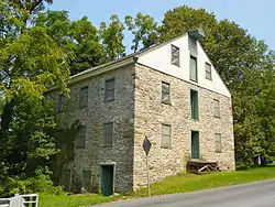 This complex consists of a 2+12-story, stone banked mill with tin roof (1854), a 2+12-story, stone Georgian-style manor house (1767), a large stone and frame barn with banked earth ramp (c. 1850), a one-story smokehouse with slate roof (c. 1767), a 1+12-story stone summer kitchen (c. 1767), a clapboarded, frame privy (c. 1939), a storage shed (c. 1939), and the millraces, dam, and pond. The mill, which ceased operation circa 1939, was built as part of a working farm.[2]