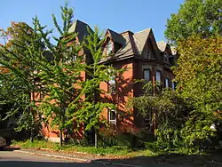 The Merrill Double House is an historic two family house at 18-20 West Street in Worcester, Massachusetts. The 2+12-story Victorian Gothic Revival brick building was built c. 1879, apparently by the heirs of a local shopowner, Enoch Merrill, whose house had previously stood on the lot. The two units are symmetrically laid out on either side of a common party wall. The center of the main facade includes a porch that shelters the paired entrances, and each side facade includes a pavilion that rises a full three stories with a steeply pitched roof.[2]