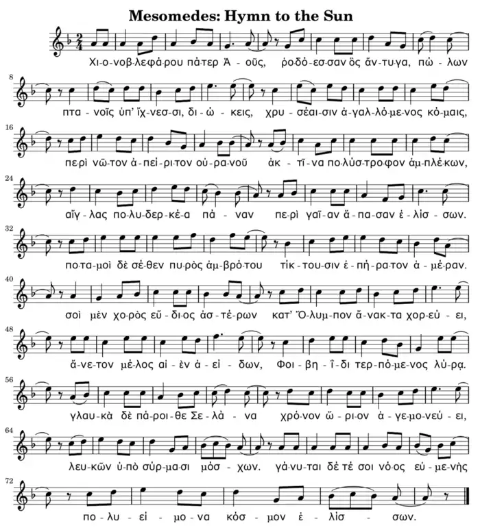 Mesomedes of Crete (Ancient Greek: Μεσομήδης ὁ Κρής) was a Greek citharode and lyric poet and composer of the early 2nd century AD in Roman Greece. Prior to the discovery of the Seikilos epitaph in the late 19th century, the hymns of Mesomedes were the only surviving written music from the ancient world.[1] Three were published by Vincenzo Galilei in his Dialogo della musica antica e della moderna (Florence, 1581), during a period of intense investigation into music of the ancient Greeks. These hymns had been preserved through the Byzantine tradition, and were presented to Vincenzo by Girolamo Mei.