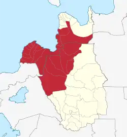 Metro Cagayan de Oro is bounded by Macajalar Bay, which curves north. Forty percent of its area is elevated plains, located partially in Bukidnon. In the western portion the Cagayan de Oro River[5] outlines the area, which is divided by the river's tributaries from district 1 of Cagayan de Oro to Gitagum (including Laguindingan, Alubijid, El Salvador and Opol). The eastern and southern regions run from district 2 of Cagayan de Oro to Tagoloan to Claveria and Malitbog to Talakag, which is bordered by Bukidnon-Central Mindanao and Lanao del Norte.[6]