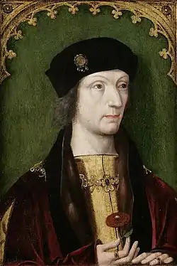 Meynnart Wewyck was one of the earliest artists of the Tudor court and his long career working for Henry VII and Henry VIII is well-documented.[1] The richness of this documentation is suggested by the recorded variants of his name. On 19 September 1502 "Mynour, the Inglis payntour" (that is, the painter to the English court[2][3]) delivered four portraits of the English royal family to James IV of Scotland at Stirling Castle.[4] These included pictures of Henry, Queen Elizabeth of York, Prince Henry (later Henry VIII), and Princess Margaret, who had been married by proxy to James in January 1502.[5]