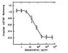 The shape of the fibronectin-decrease curve is more usual, although not quite: the separate parts of the curve are all more or less linear, which is not the case in an S-shaped curve. In this case, a maximum dose can be determined: above concentrations of about 103 ng/mL the effect remains more or less stable. A NOAE-level is visible for concentrations of up to 1 ng/mL of mezerein. The concentration that gives half-maximal effect is approximately 90 ng/mL. The difference with the half-maximal concentration for 2-DG transport is remarkable. Mezerein causes a 46-fold lower effect for fibronectin decrease than for 2-DG stimulation, and apparently only causes this effect at high concentrations. This might also correlate with mezerein being a weak tumor promoter.
