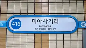 Miasageori Station is a station on the Seoul Subway Line 4. Its name means "four-way junction in Mia-dong." It is located in Mia-dong, Gangbuk-gu, Seoul. It was previously called Miasamgeori (미아삼거리), until December 26, 2013.[2][1]
