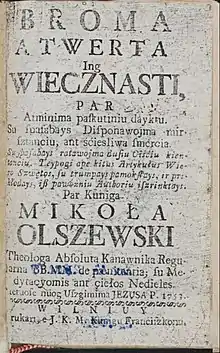 Michał Olszewski (Lithuanian: Mykolas Olševskis also Ališauskis, Alšauskis, Olšauskis; c.1712 – c.1779) was a Lithuanian Roman Catholic priest and a member of the Canons Regular of the Penitence of the Blessed Martyrs from the Grand Duchy of Lithuania. In 1753, he published a Lithuanian language collection of religious readings Broma atwerta ing wiecznastį... (The Gate Open to Eternity) which became very popular and over the next hundred years was reprinted at least sixteen more times. Despite its popularity, Broma was criticized both for its naive content and impure language full of loanwords and barbarisms.