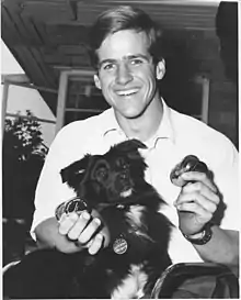 ![]() Michael Dow and his dog, Hitam, displaying his five Olympic medals from the 1964 Tokyo Paralympic Games | ||||||||||||||||||||||||||||||