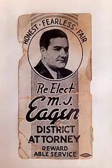 Eagen earned an undergraduate degree in 1927 at St. Thomas College in Scranton, Pennsylvania, before enrolling at Harvard Law School. He left Harvard Law School after completing one year to return home and assist his family, as his mother had lost the family business. He took a teaching position at St. Thomas High School teaching geometry. Eagen began clerking and studying law for Attorney James Powell, for which he received the sum of fifty dollars per month. At age 24, he passed the State Bar exam and was admitted to practice law on September 23, 1931. Shortly after his admission to the bar, in 1933, Eagen filed nominating papers on the Democratic ticket for District Attorney in Lackawanna County which consisted of 105,000 Republicans and 15,000 Democrats. He won by 507 votes and was elected District Attorney of Lackawanna County, Pennsylvania. At age 26, he was the youngest elected District Attorney in County history. He was reelected District Attorney in 1937.