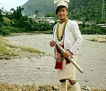 The traditional costume of Miji women consists of an ankle-length white garment with a beautifully decorated red jacket. Unlike the majority of other tribes of Arunachal Pradesh, India; the Miji people wear silver ornaments, and glass/brass based necklaces.[1] Indigenous cosmetics are made from pine resin and coal ( specially during marriage ceremonies). The traditional dress of Miji community constitute of (1)_Grii za (cotton cloth), (2)_ornamental beads, (3)_silver/Bamboo crown, (4)_Gichin thay ( long cotton cloth, red in colour, which serves as a belt), (5)_waichin ( sword ), (6)_Lai lo (cotton cloth to cover lower portion of legs), (7)_Lai Drangk (ornamental beads to keep Lai lo intact), and other ornaments including necklaces, bangles and ear tops.