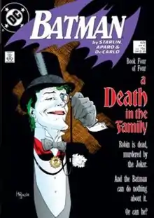 When asked if fans continued to question him about that cover, he replied, "You know, it does crop up. When people talk about my career, that is one of the covers that a lot of people kind of go back to. I wish I had something profound to say about it. But at the time, it was just another job."[12] In contrast, Mignola did not address his cover illustration of the Joker, and the accompanying cover text, for Batman #429. His visual depiction of the Joker anticipated prospective advertisements for his work in Gotham by Gaslight, yet the cover text still adhered to the "Death in the Family" storyline. This Elseworlds Joker is only briefly discussed in Gotham by Gaslight as a man who married ten wealthy widows, poisoned all ten with strychnine, and then ingested the poison himself when police attempted an arrest, resulting in partial facial paralysis. Mignola included a black-and-white police sketch in Gotham by Gaslight that did not replicate his Batman #429 cover art, choosing instead to root that Elseworlds incarnation of the Joker in Conrad Veidt's 1928 portrayal of Gwynplaine for The Man Who Laughs. A scene from Tim Burton's Batman, released in June 1989 (United States), additionally featured Jack Nicholson's Joker in a top hat, but without a monocle.[13] Two years later, Jack Shaheen published an assessment of Islamophobia pervasive in Jim Starlin's plot and Jim Aparo's interior pencils for "Death in the Family," particularly Batman #429, which prompted debates over Mignola's intentions.[14]