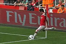 Arteta initially started out playing as a number 10 in the Barcelona youth system, and was later shifted to the position of a "pivot" or defensive midfielder, as he was thought to be a player in the mould of Pep Guardiola.[51] He was rated as the sixth most effective player in the Premier League in 2006–07 by the official player ratings system the Actim Index. Arteta returned to his original deeper midfield role at Arsenal.[52] in which he excelled as his team's playmaker, due to his technique, skill, vision, passing, awareness, and tactical intelligence.[53][54][55][56] His total of 12 league assists in the 2006–07 season was third to Cesc Fàbregas and Cristiano Ronaldo.[57] With 100 fouls committed against him in the same season, he was the most fouled player in the Premier League.[58]