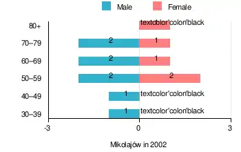 According to the 2002 Poland census, there were 13 people residing in Mikołajów village, of whom 61.5% were male and 38.5% were female. In the village, the population was spread out, with 7.6% from the age of 18 to 44, 46.2% from 45 to 64, and 46.2% who were 65 years of age or older.[2]