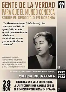 Milena Rudnytska (Ukrainian: Мілена Рудницька: 15 July 1892 – 29 March 1976) was a Ukrainian educator, women's activist, politician and writer. One of the most influential voices in the interwar period of the Galician women's movement leadership, she published articles in various periodicals. As a member of the Polish Sejm between 1928 and 1935, she brought issues of suppression by government authorities to the world stage, including the Polish regime's efforts to repress the culture of minority Ukrainians and the Soviet regime's denial of starvation in Ukraine during the Holodomor. With the Soviet and Nazi occupations of Ukraine, Rudnytska fled the country and remained an exile for the remainder of her days, publishing books and articles as she moved throughout Europe and the United States.