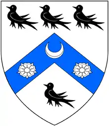 Arms of Watson, Baron Manton: Argent, on a chevron azure between four martlets three in-chief and one in-base sable a crescent between two roses of the field