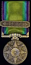 The China Incident Medal (支那事変従軍記章, Sina jihen jūgun kishō) medal was created by Imperial Edit No. 496 on July 27, 1939;[10] and was awarded for service in China at any time from the 12th through the 20th years of the Shōwa period -- Shōwa 12-20 (1937–1945).[11] An amendment was promulgated by Imperial Edict No. 418 in 1944; and the decoration was abolished in 1946 by government ordinance No. 177.[10]