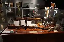 Murphy was initially assigned to the Intelligence Office headquarters, 1st Battalion, 141st Infantry as S-2, and attended the Guard's two-week summer training at Fort Hood as a range officer.[133] 19 December 1950, Murphy was transferred to division headquarters as an aide to Ainsworth.[134] At the 1951 summer training camp at Fort Polk, Louisiana, Murphy was in charge of training approximately 500 inexperienced new recruits in bayonet, marksmanship and close order drill.[135] Fellow instructor Captain Tom Berry remembered, "In my opinion, Audie Murphy set the tone for the obvious high esprit de corps for the 36th Division which lasted throughout my association with the Division [eighteen years]. Audie Murphy walked the way he talked."[136]