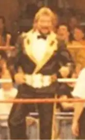 In early 1990, Jake "The Snake" Roberts stole the belt during his feud with DiBiase.[4] This also led to a face turn for the Big Boss Man, who resented his manager Slick selling his services to DiBiase in order to retrieve the belt from Roberts. After attacking Roberts and stealing the bag containing the belt and Roberts' pet python named Damien, DiBiase, the Boss Man, and Slick headed for "The Brother Love Show" where DiBiase bragged about buying the Boss Man's services. The Boss Man then told both Slick and DiBiase that he could not be bought and immediately returned the bag to Roberts, who had been left handcuffed to the ring ropes. The Boss Man then released Roberts, walked back to the Brother Love set, pushed Slick, and again told an irate DiBiase that he could not be bought before walking off to the cheers of the crowd, cementing his face turn.[5] DiBiase had his bodyguard Virgil get the belt back from Roberts at WrestleMania VI after Roberts was counted out during their match at the SkyDome.[6]