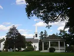 Milton Centre is located on a prominence known local as Academy Hill. The town was settled in 1633 as part of Dorchester, and was separately incorporated in 1662. Its first meetinghouse was built on Milton Hill, but Academy Hill was selected in 1727 (after many years of controversy) as the site of the town's third meetinghouse. The fourth meetinghouse, built in 1788, is now the First Parish Church, and is the oldest surviving building in the center. The town's economic activity was focused along the Neponset River, and the town center remained relatively rural until the 19th century, when Milton Academy was founded and located on land to its east. This was joined by the First Congregational Church in 1834, and a new town hall in 1837. The site of that town hall is where the present town hall (built 1970) is located.[2]