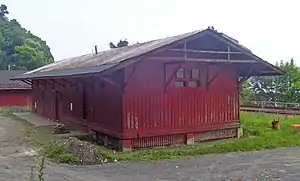 The building is a one-story frame 30-by-83-foot (9.1 by 25.3 m) rectangular building with a broad gable tin roof and overhanging eaves. Its board-and-batten siding is painted red. The northern two-thirds of the building, the oldest part, sits on a sandstone foundation, while the southern portion rests on masonry piers.[1]