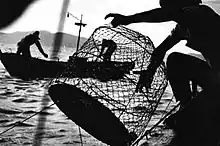 By the time of the outbreak of Minamata disease the fishing situation had become critical. From 1953 to 1957 the fish catch in Minamata had declined by a staggering 91%.[1] In 1956, the Kumamoto prefectural government had attempted to limit the spread of the disease by banning the sale of fish caught from Minamata Bay, but did not issue and all-out ban. This left fishermen with fish they could not sell, but no financial assistance to compensate their losses. In September 1958 the Minamata Fishing Cooperative petitioned the prefecture to ban fishing completely so that their members might be properly compensated under the Fisheries Law and Food Sanitation Act. The government did not respond and only advised the fishermen against consumption of the fish and shellfish they caught from the bay. However, with no source of income, many fishermen were left with no choice but to eat the suspect fish they caught. In fact, throughout the history of the Minamata disease problem, the catching of fish from Minamata Bay has never been legally prohibited.[2]